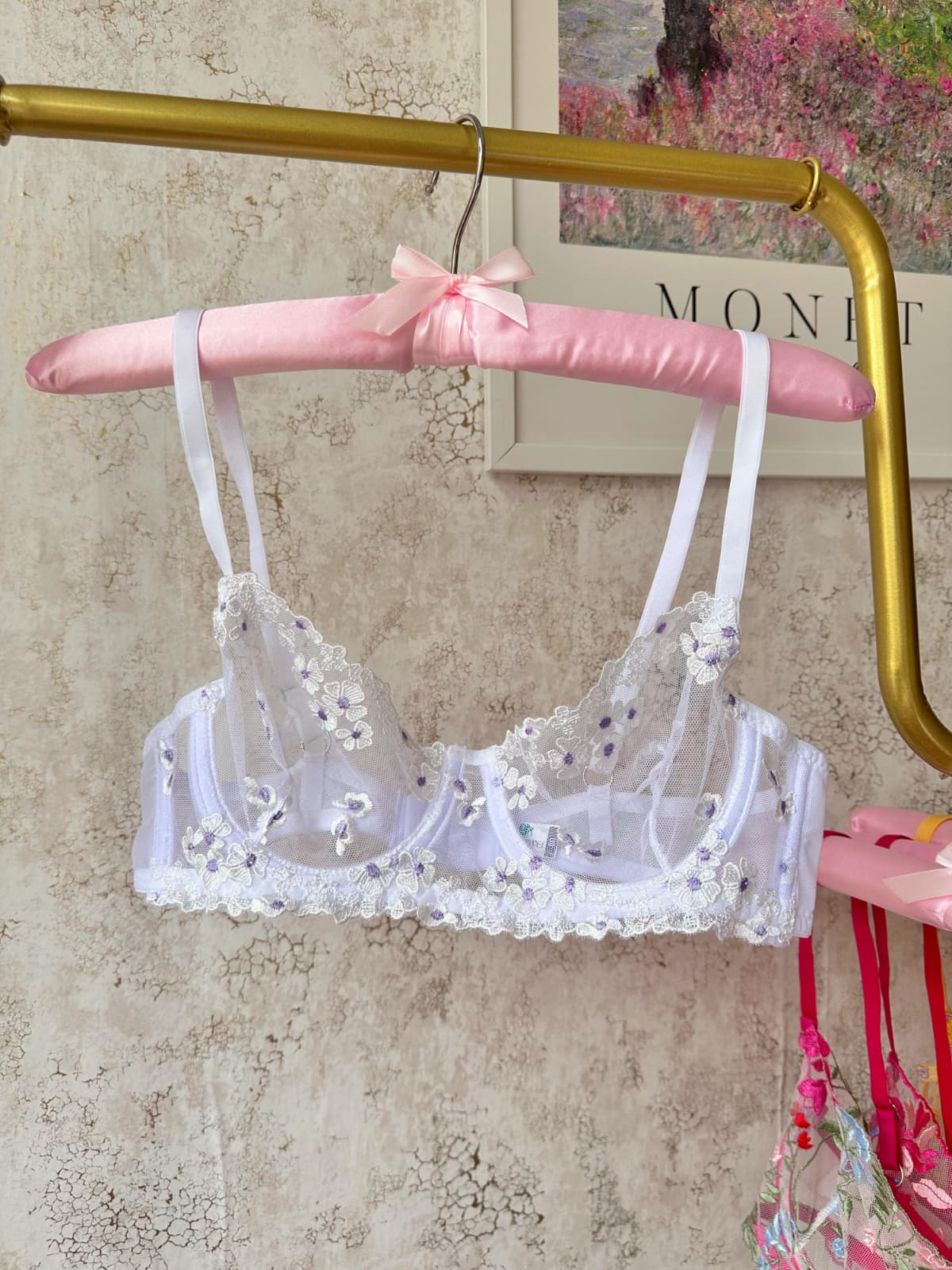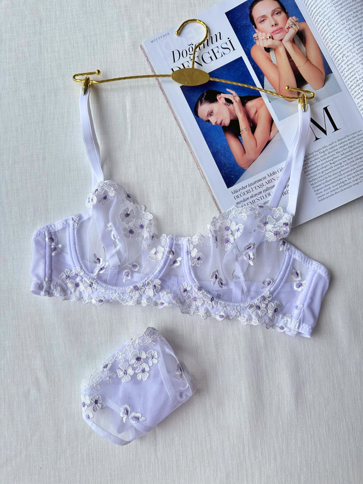 Beyaz Mor Çiçekli Dantelli Balenli Balkonet Sütyen Takımı