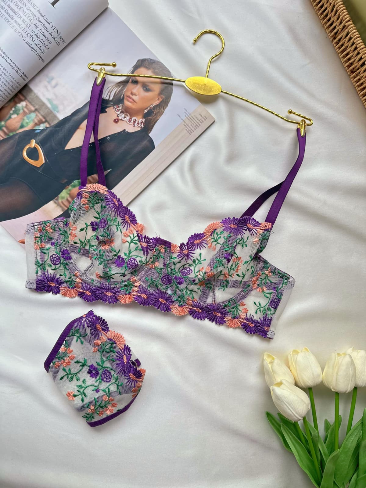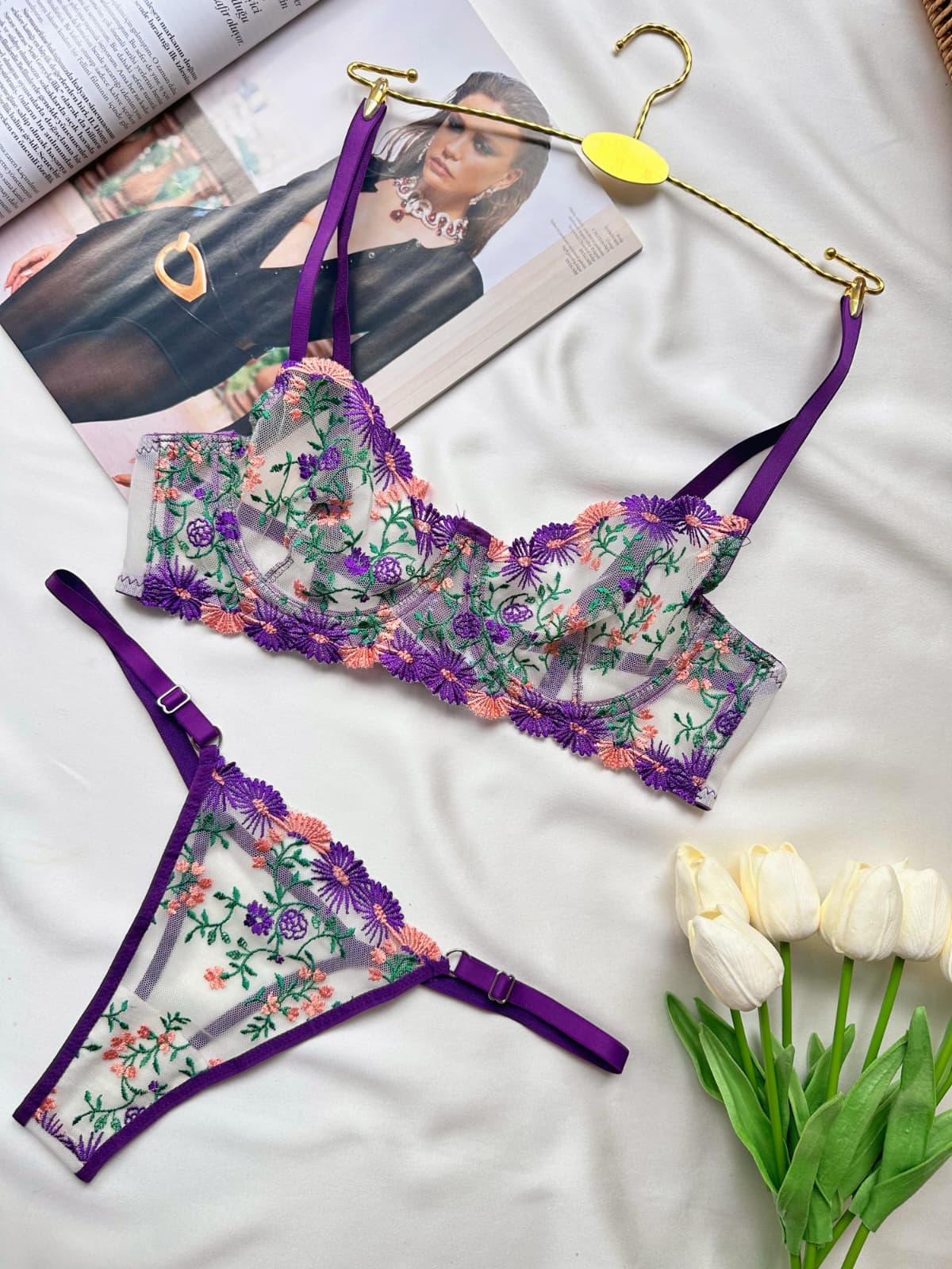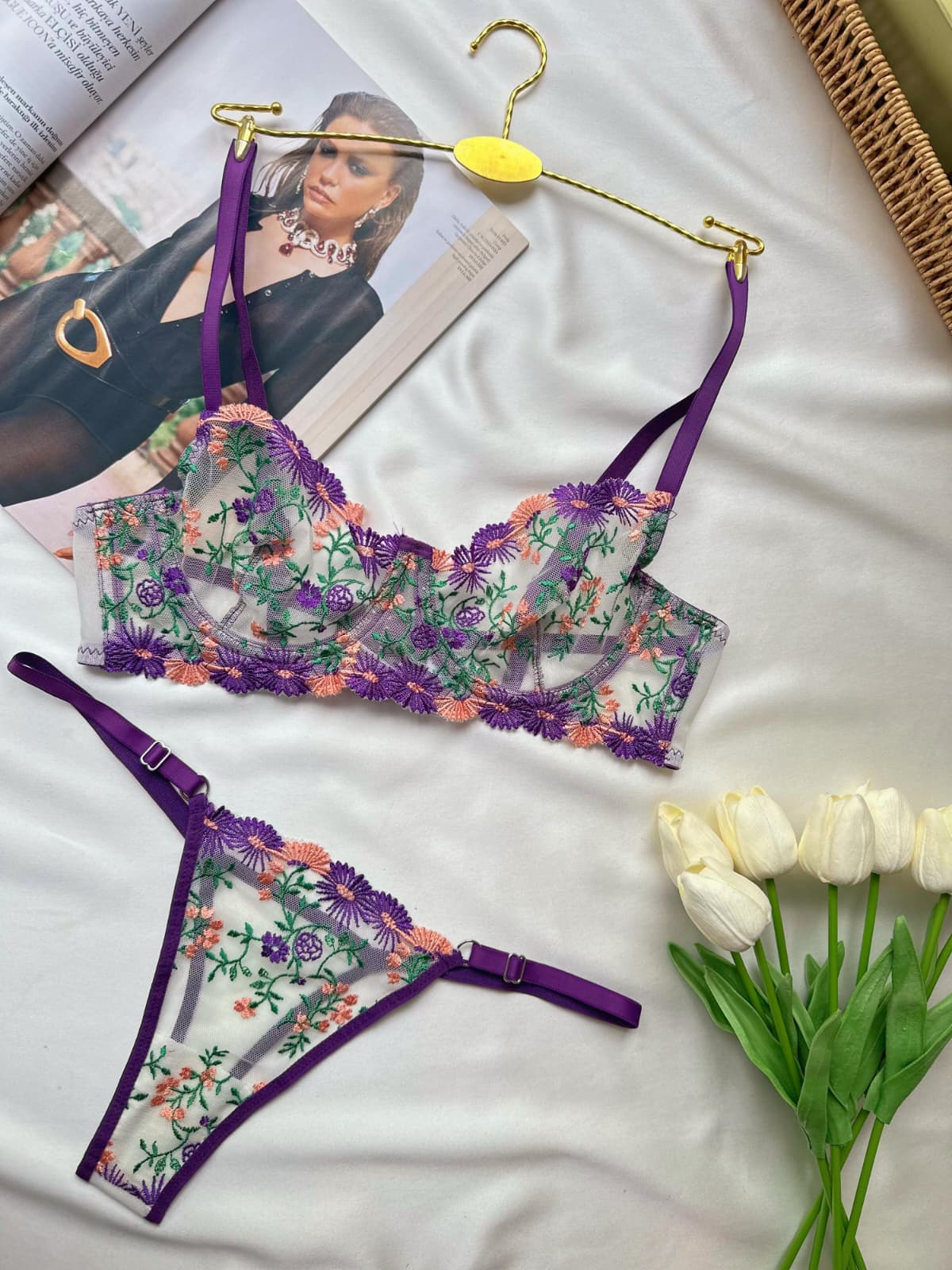 Mor Çiçekli Balenli Balkonet Sütyen Takımı