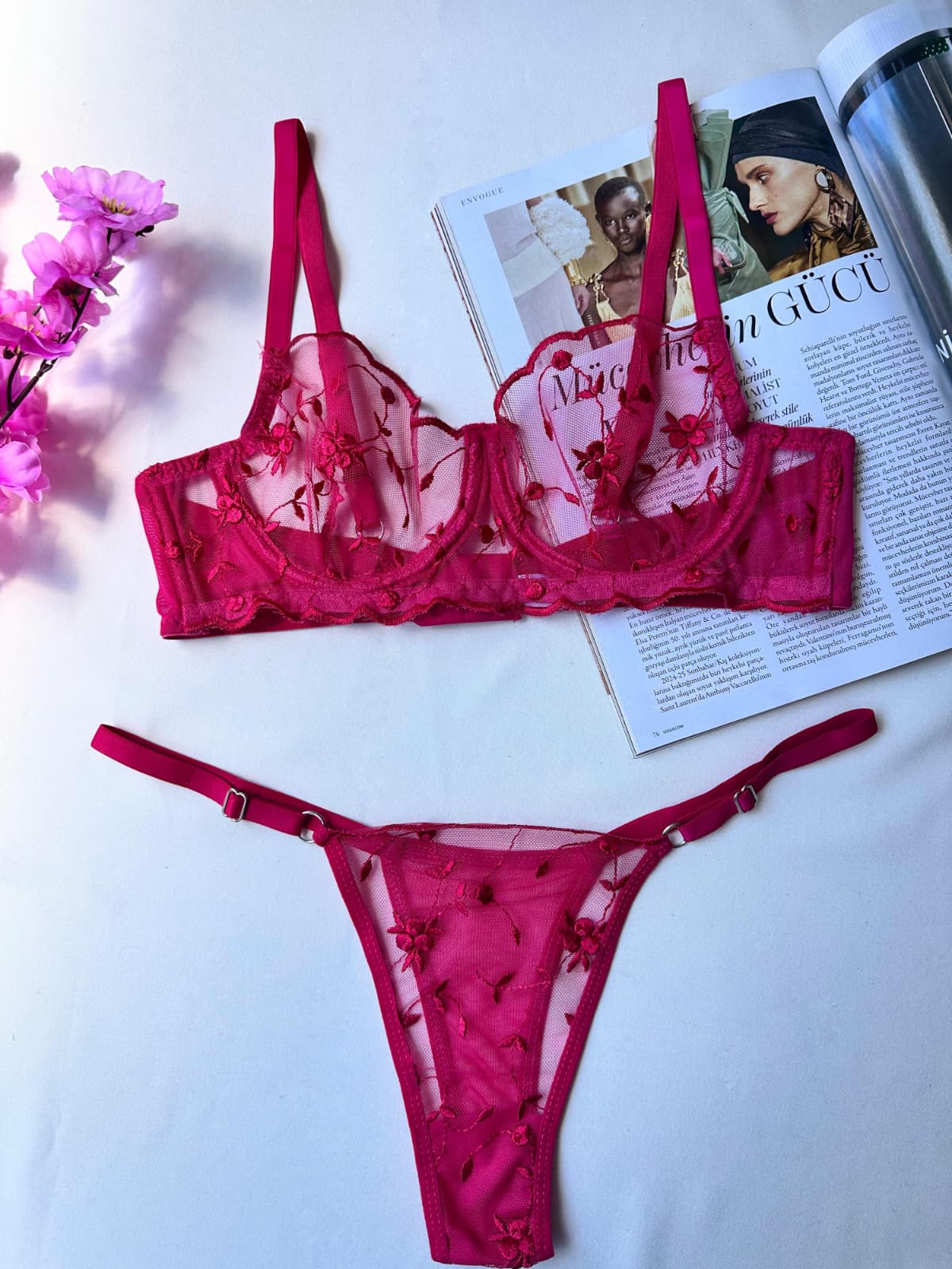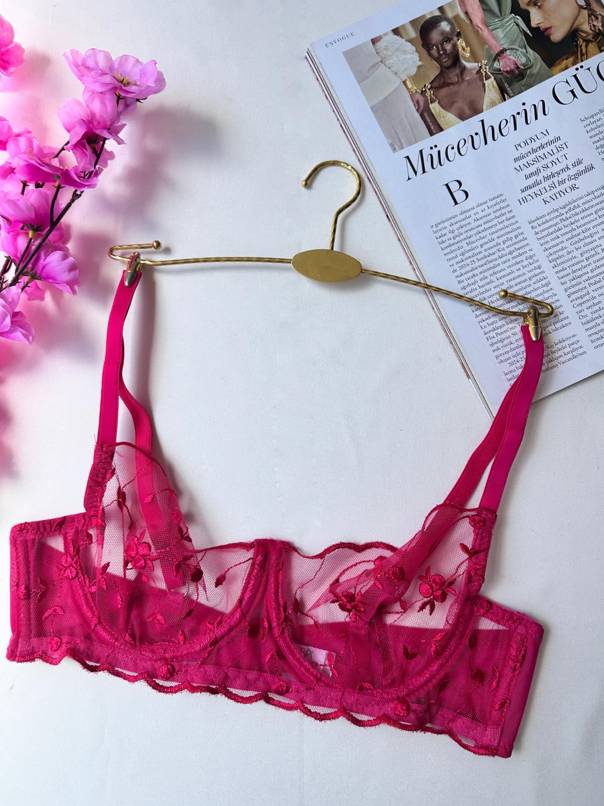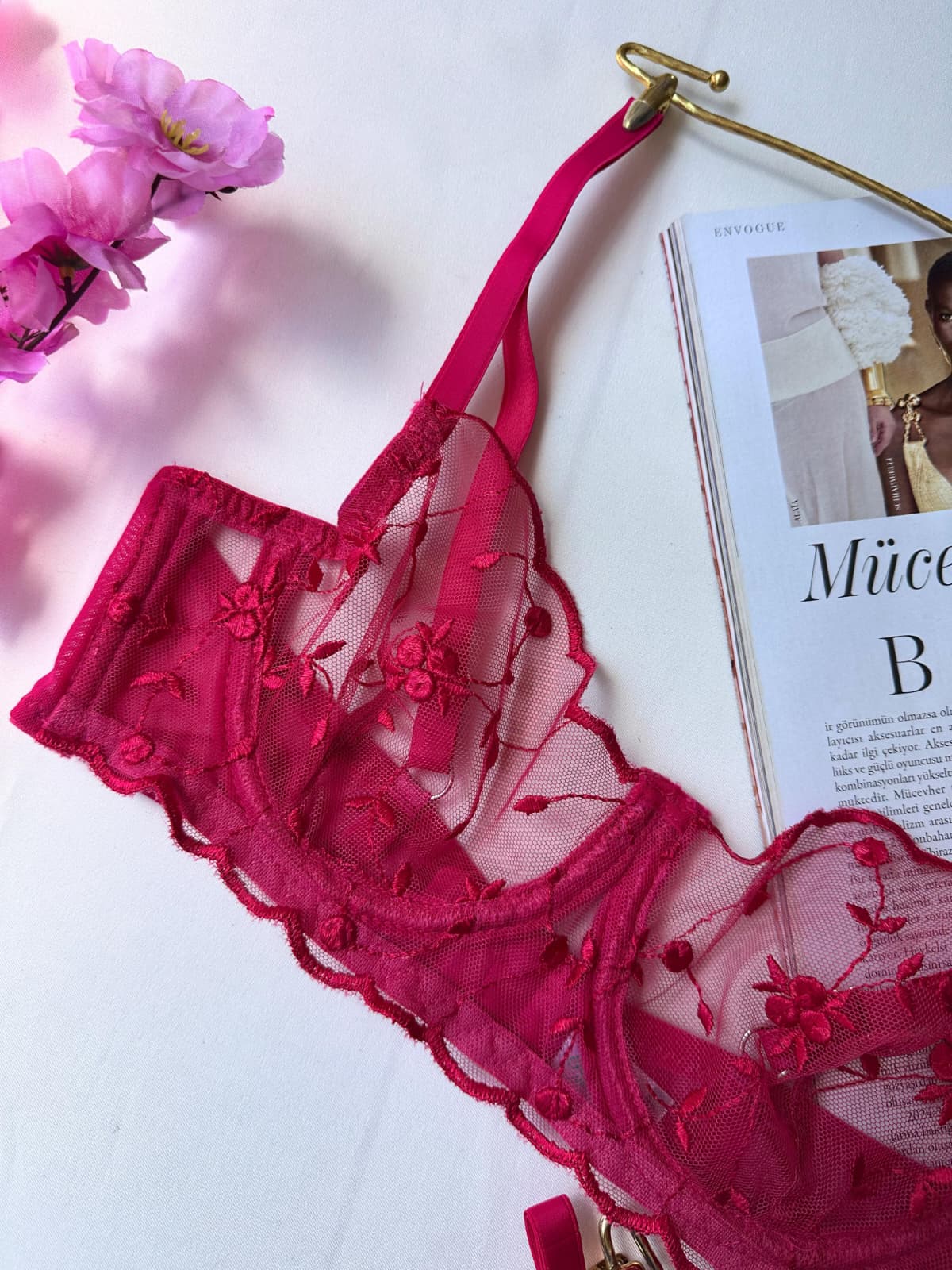 Koyu Pembe Çiçek Dantelli Balenli Balkonet Sütyen Takımı
