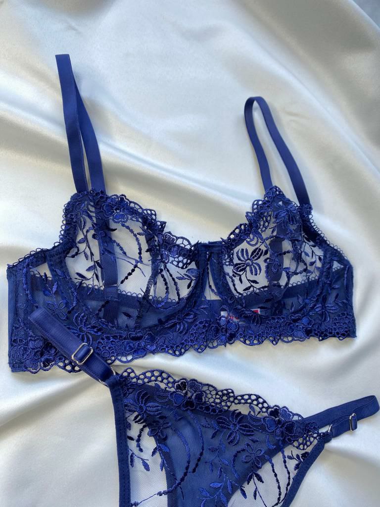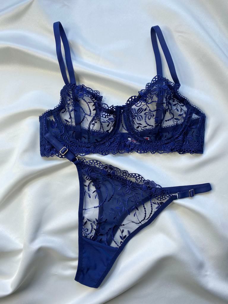 Lacivert Çiçek Dantelli Balenli Balkonet Sütyen Takımı