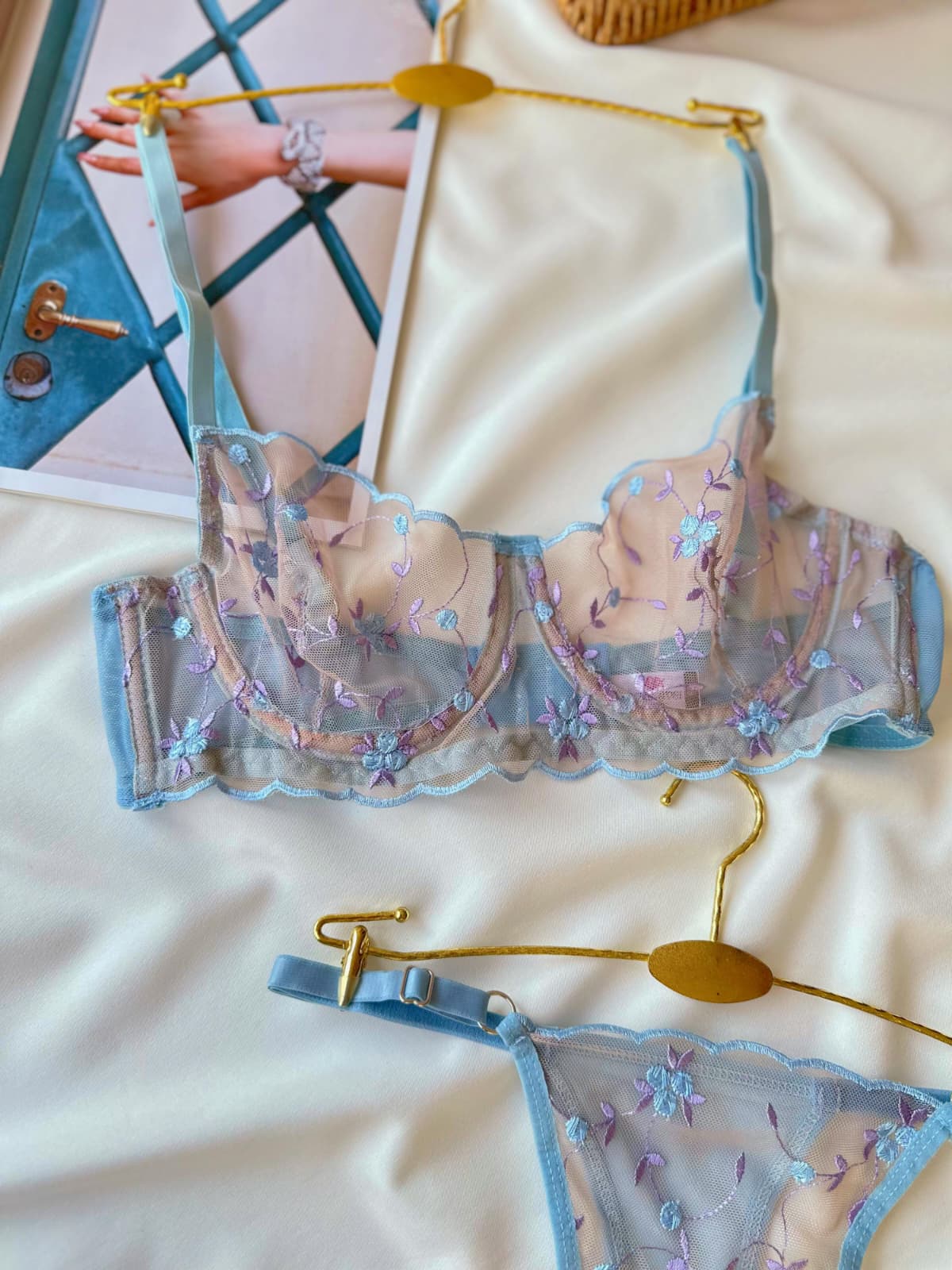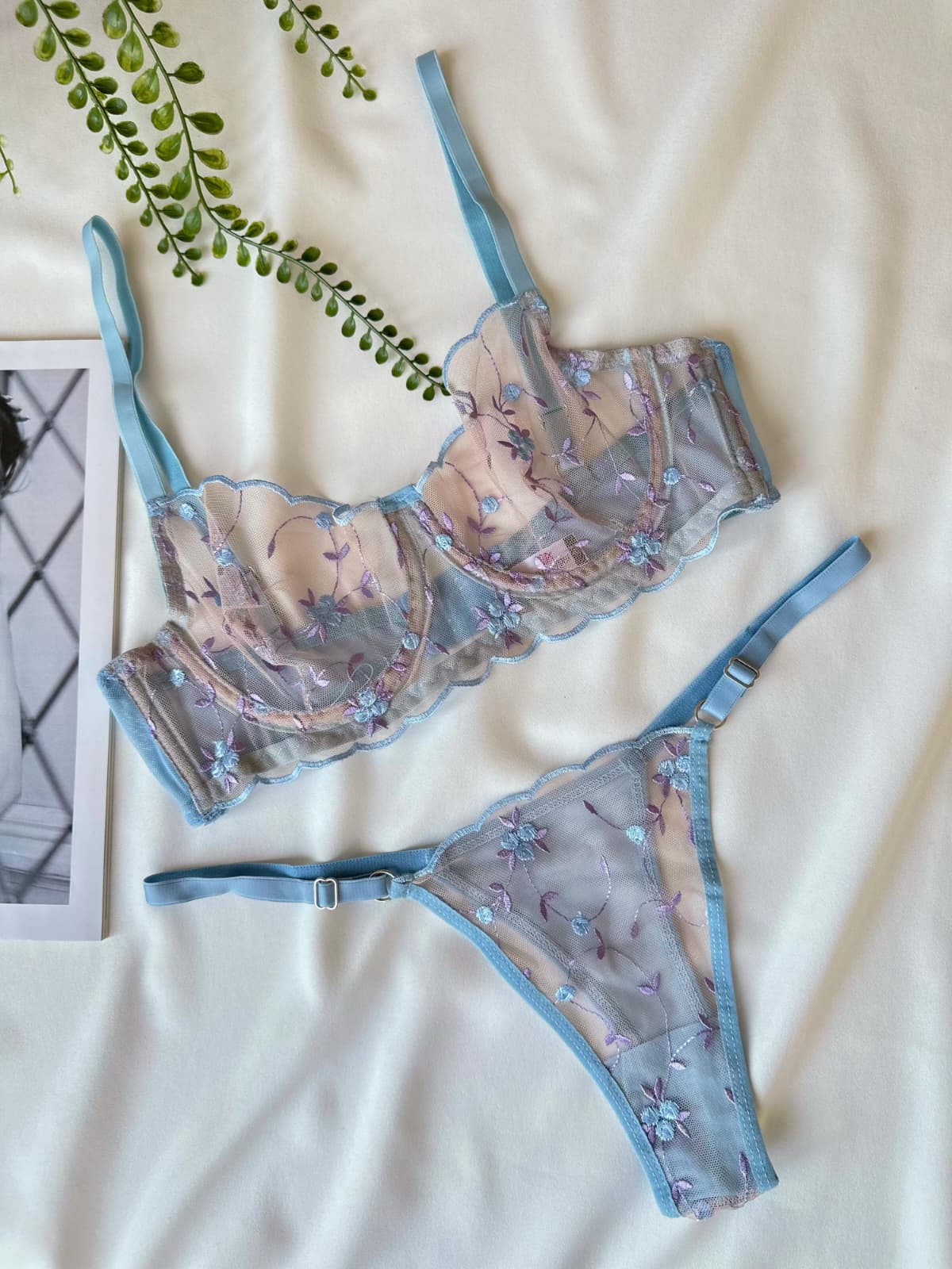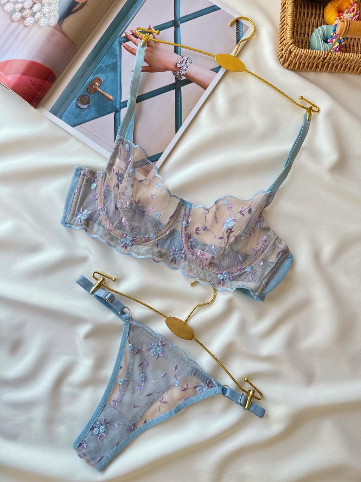 Açık Mavi Çiçekli Dantelli Balenli Balkonet Sütyen Takımı