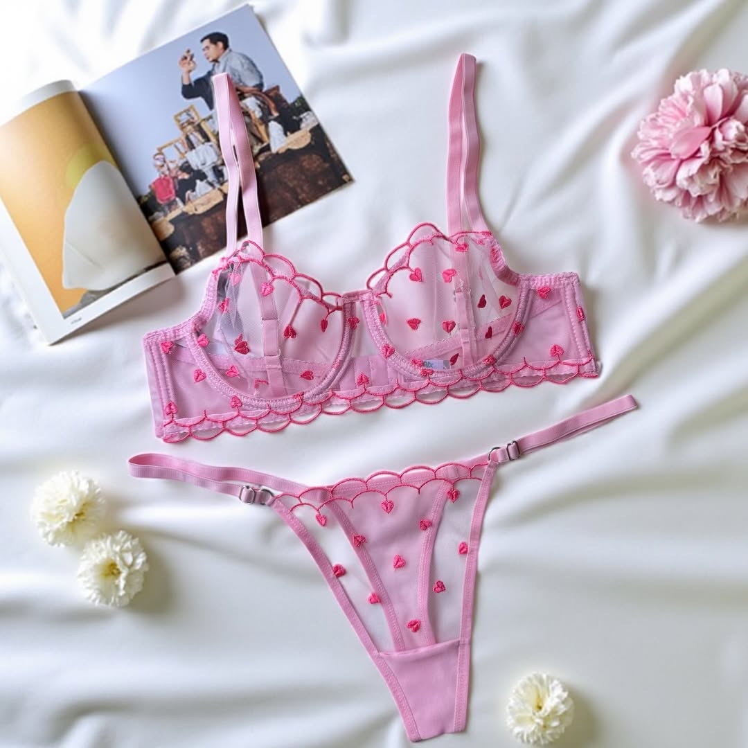 Pembe Kalpli Dantelli Balenli Balkonet Sütyen Takımı