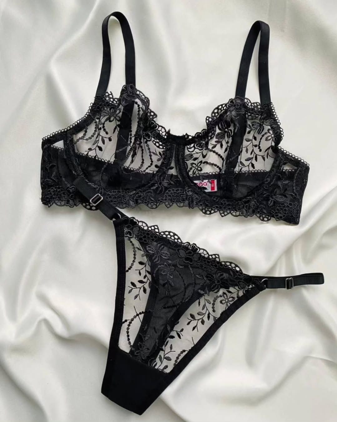 Siyah Çiçekli Dantelli Balenli Balkonet Sütyen Takımı M2